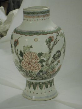 | Description | Qing-Dynastie (1644-1911); Vase, eiförmig mit eingezogenem Fuß und Hals, in Muffelfarben bunt bemalt: großer Päonienzweig und andere Blüten, Vögel und Schmetterlinge, vergoldete Sonne; an den Rändern grüne und rote Zacken. Das Objekt ist im Katalog durch Ohlmers Sammlung unter der Nr. 11 (1932) und Nr. 48 (1898 Bunt) zu finden. |