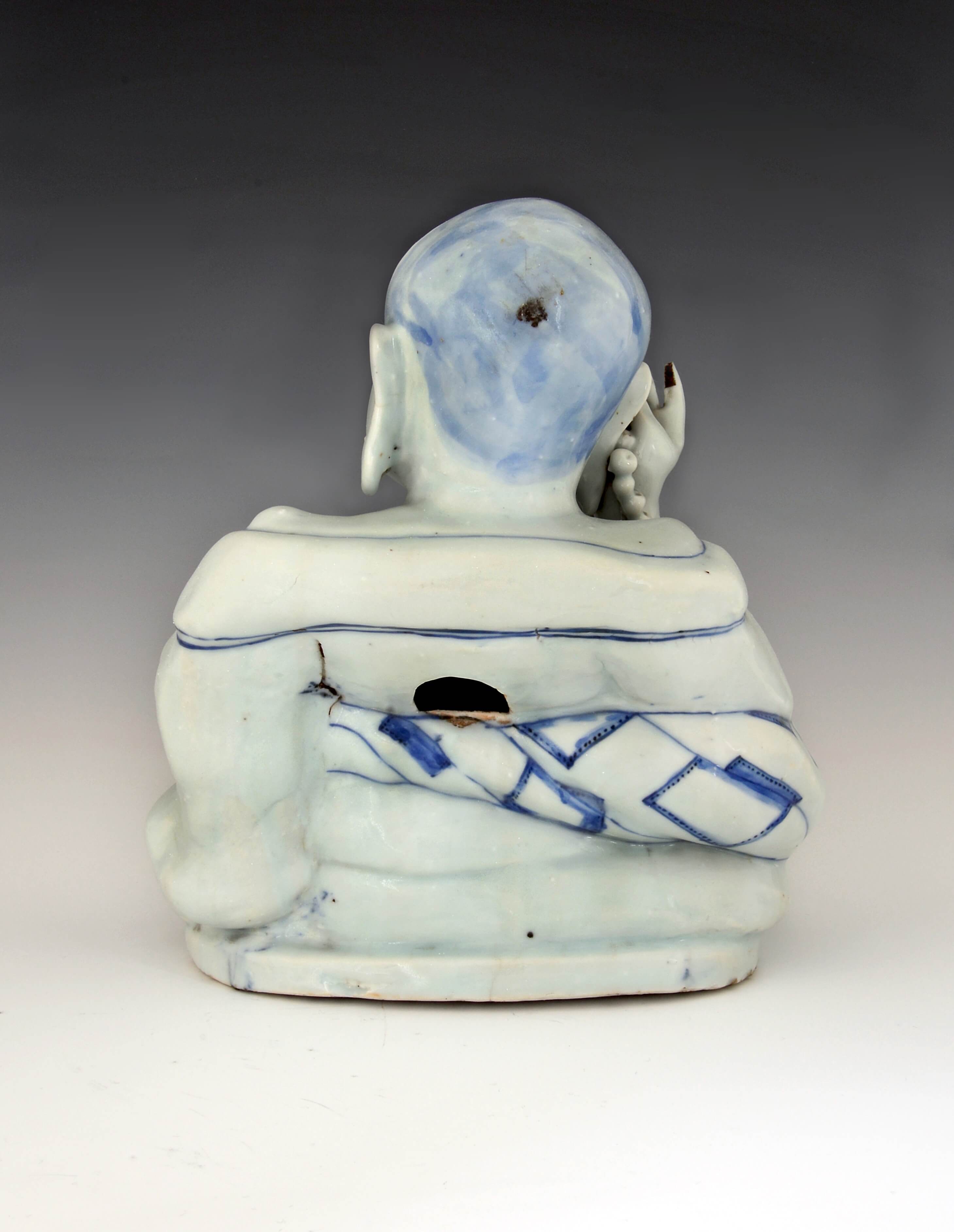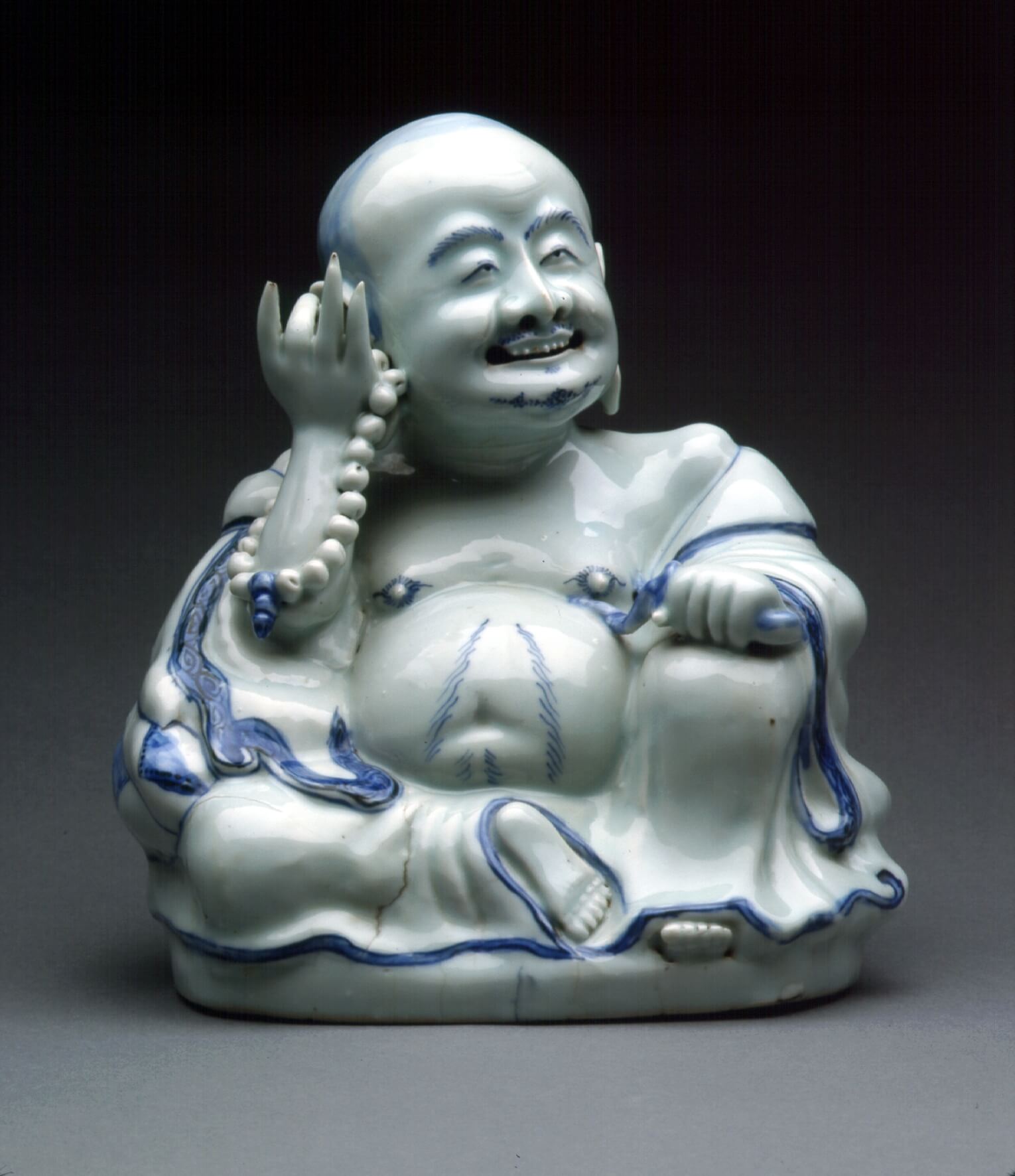 | Description | Mit untergeschlagenem rechten Bein sitzt der dickbauchige, freundlich lächelnde Budai auf dem Boden und hält in seiner rechten Hand einen Rosenkranz und in seiner linken den Zipfel des Sacks, gegen den er sich lehnt. Die Figur ist unten geschlossen und hat hinten ein halbkreisförmiges Brandloch, ebenso im Mund. Der Dekor ist sparsam in Unterglasurblau gemalt. Der karikierend dargestellte Budai ist der volkstümliche Gott des Glücks und der Zufriedenheit. Das Objekt ist im Katalog durch Ohlmers Sammlung unter der Nr. 169 (1932) und Nr. 73 (1898 Blauweiß) zu finden. |