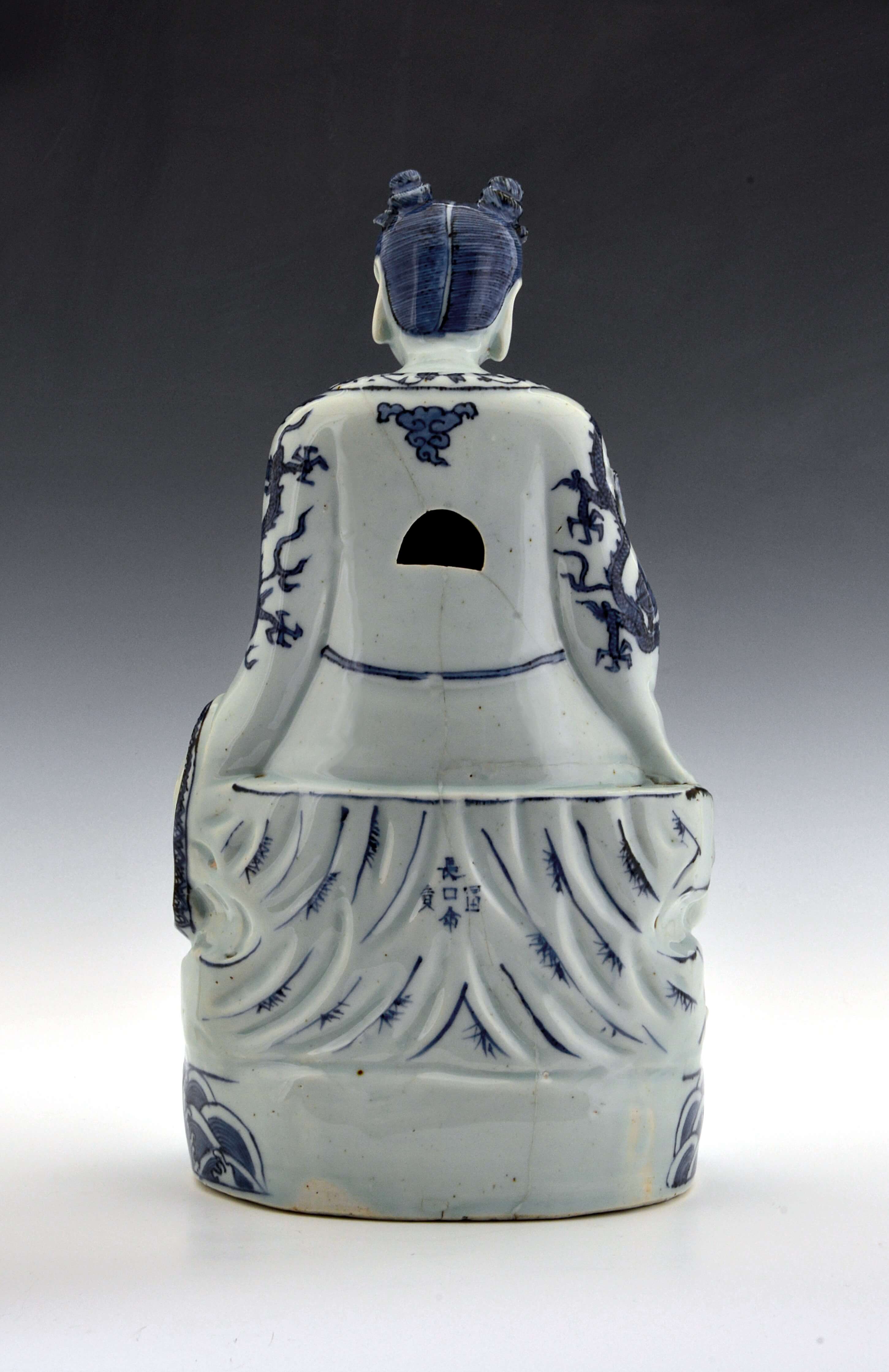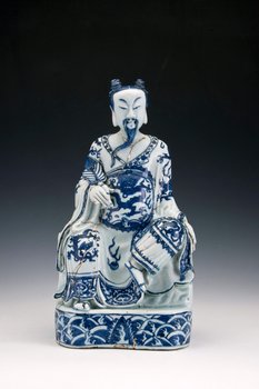 | Description | Ming-Dynastie (1368-1644); Gekleidet in ein Beamtengewand mit vierklauigem Drachendekor, sitzt der Unsterbliche auf einem Sockel, das linke Bein leicht angewinkelt, und hält in der rechten Hand einen Fächer, während er die linke lose herabhängen lässt. Darunter ist eine gemalte Zone mit einem spitzen Felsen in der Mitte und schäumenden Wellen. Die Figur ist unten geschlossen mit einer eingetieften unglasierten Basis und hat auf dem Rücken ein halbkreisförmiges Brandloch. Der Dekor ist in kräftigem Unterglasurblau gemalt, mit Konturzeichnung und laviert in einem einzigen Ton. Auf der Rückseite hat die Figur die Aufschrift: Chang ming fu gui, "Langes Leben, Reichtum und Ehre", deren Zeichen in Form einer Münze angeordnet sind. Entsprechend der Anzahl der Unsterblichen gehörte die Figur wahrscheinlich zu einem Satz von acht. Möglicherweise handelt es sich bei dem Dargestellten um Zhongli Quan, dessen Attribut u.a. ein Fächer ist. Ähnliche Beispiele wurden 1935 in London gezeigt (Chinese Art Exhibition, Kat.Nr. 1926) und 1954 in Venedig (Mostra d'Arte cinese, Kat.Nr. 678). Weitere Beispiele befinden sich im John Herron Art Institute, Indianapolis (Judith u. Artur Hart Burling, Chinese Art, New York 1953, Abb. 341) und im Institut Néerlandais, Paris (Lion-Goldschmidt, Ming, Abb. 159). Das Objekt ist im Katalog durch Ohlmers Sammlung unter der Nr. 170 (1932) und Nr. 68 (1898 Blauweiß) zu finden. |