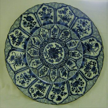 | Description | Marke: Quadrat im blauen Doppelkreis Großer flacher Teller mit dunklem Unterglasurblau. In der Mitte Blume umgeben von Wolkenband sowie zwölf kleineren und größeren Feldern mit Blumen. Gerader Fond, gewölbt und abgesetzt schräg aufsteigende Fahne. Außen drei Blütenranken. Das Objekt ist im Katalog durch Ohlmers Sammlung unter der Nr. 298 (1932) und Nr. 113 (1898 Blauweiß) zu finden. |