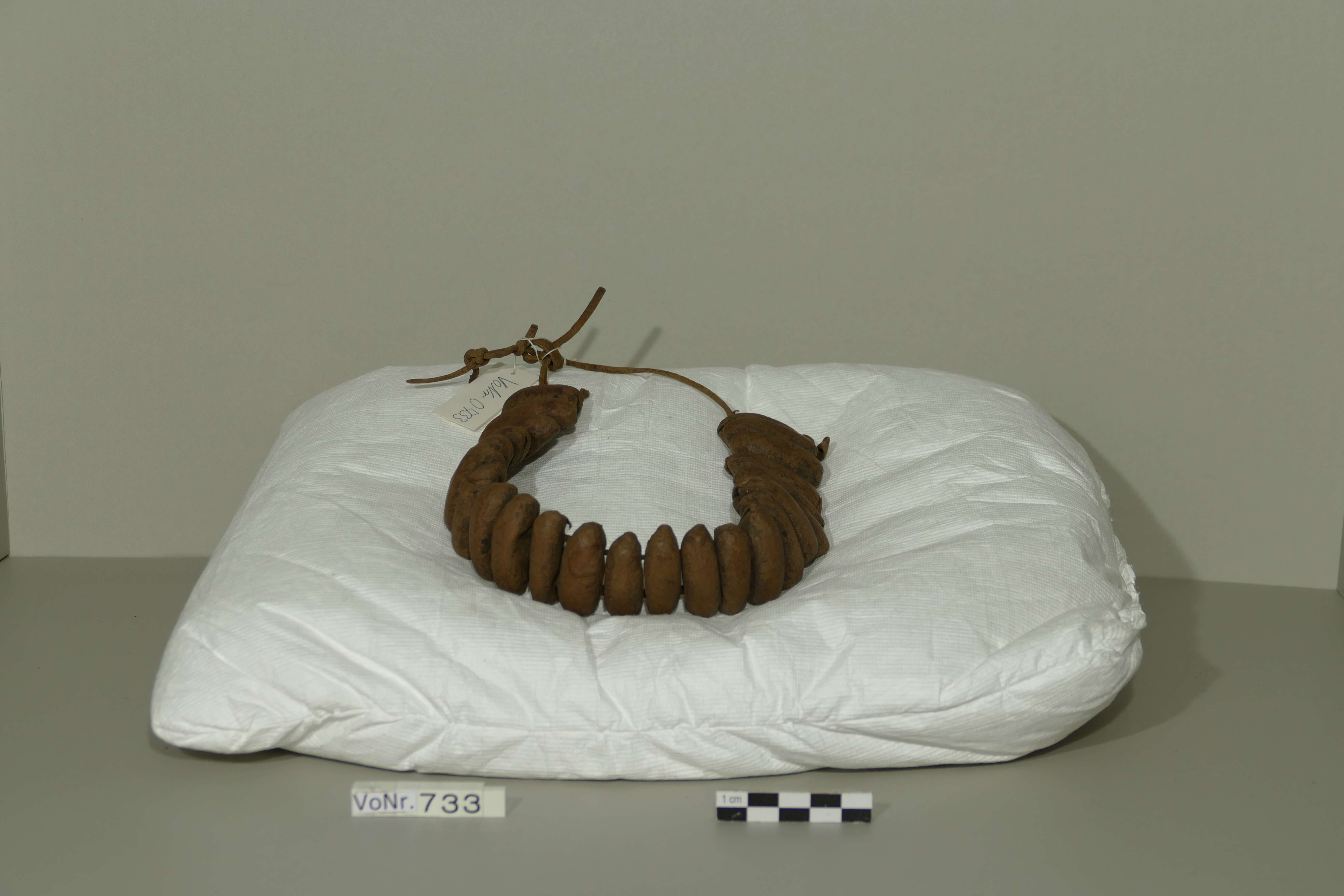 | Inscription au livre d'inventaire | Knieschmuck aus klappernden Früchten, auf schmale Lederstreifen gereiht. |