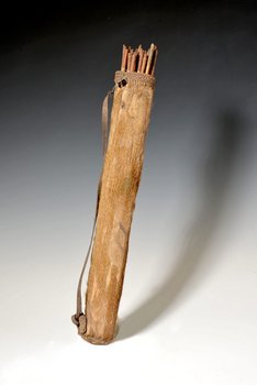 | Inscription au livre d'inventaire | Köcher aus Fell mit durchflochtenem Rande mit 31 Pfeilen, die keine eigentliche Kerbe im gewöhnlichen Sinn, sondern nur einen einseitigen Kerbensporn haben. |