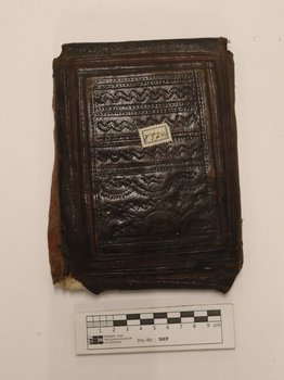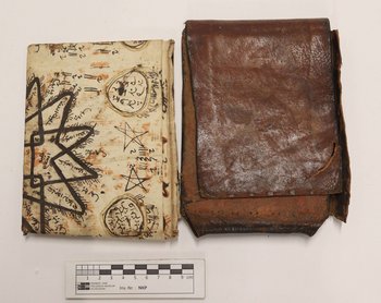 | Inscription au livre d'inventaire | 3 fache Ledertasche innen Schrift eingenäht. Amulett bei Kriegszügen. Kamerun, Adamaua. Heller Carnap Kauf. 19.XI.1908. |