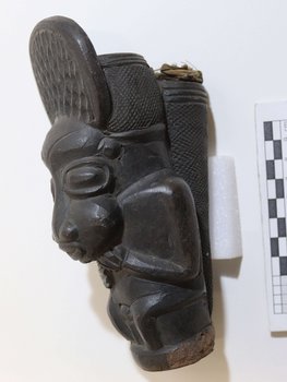| Inscription au livre d'inventaire | Pfeifenkopf aus schwarzem Ton, in Form menschlicher Hockerfigur. Kamerun, Grasland, Südbezirk ("Jang-Bezirk" = Dschang (?)). Museum für Völkerkunde Berlin (Walden) Kauf. (Unter Inv.-Nr.:) 061. |