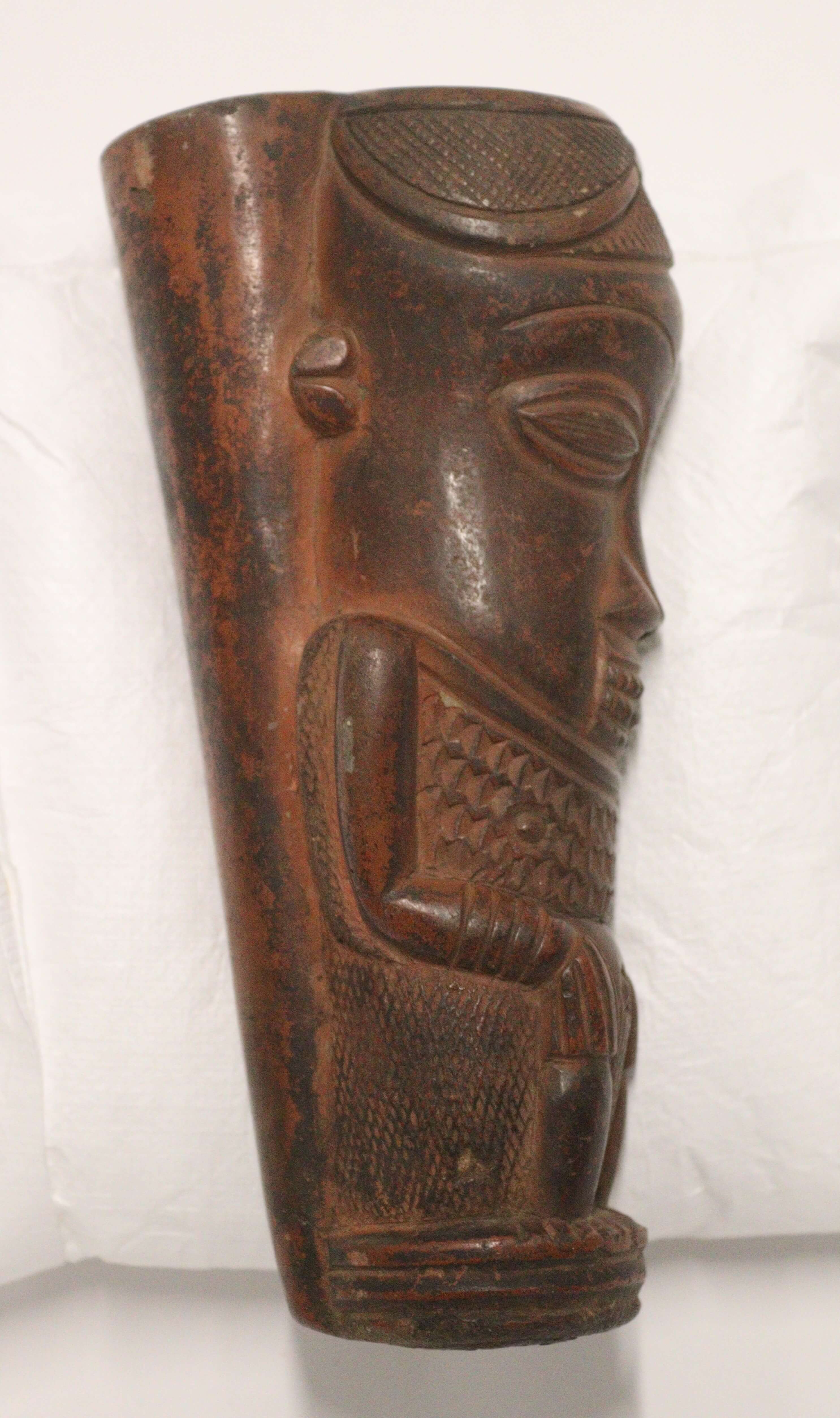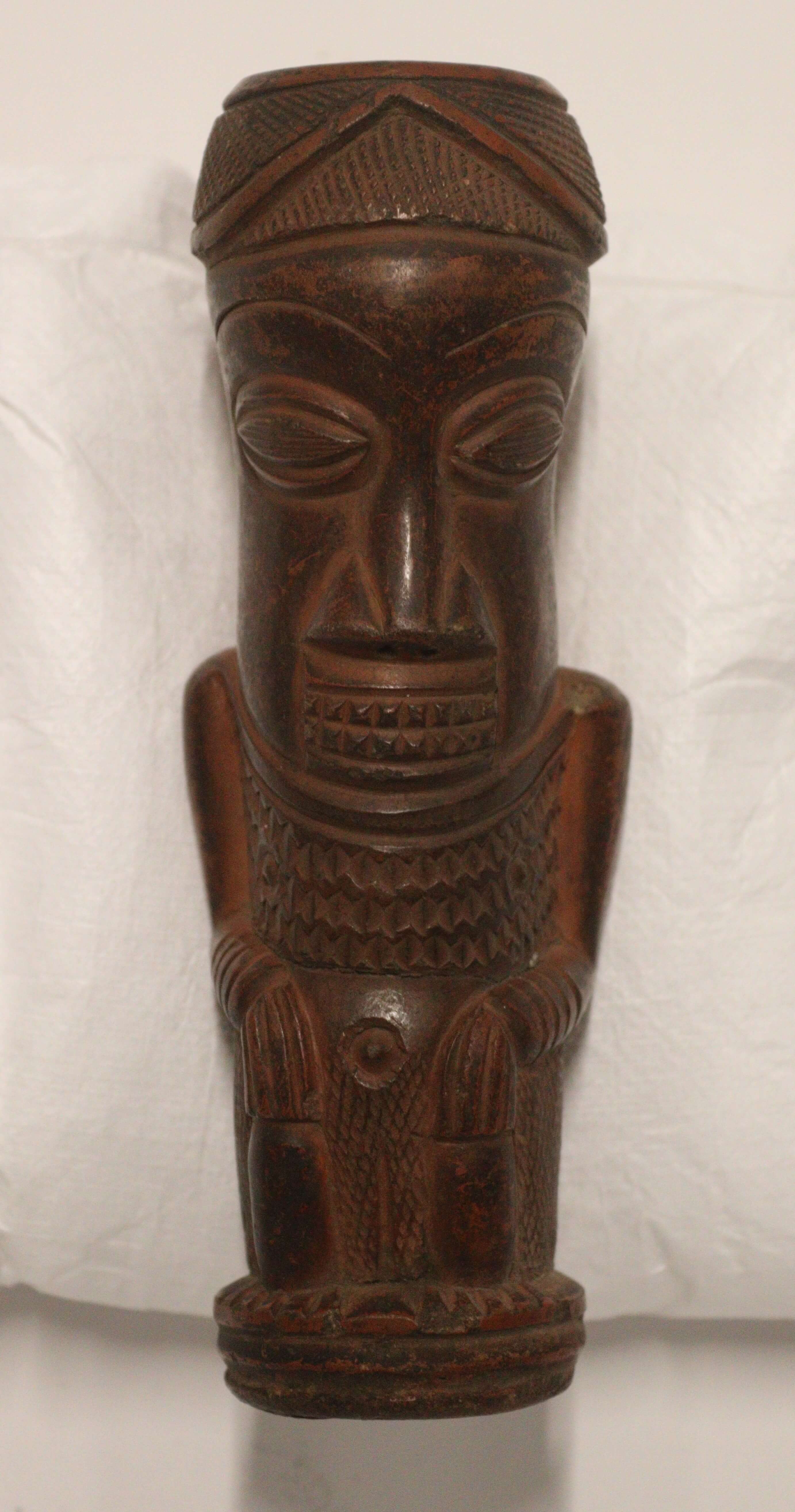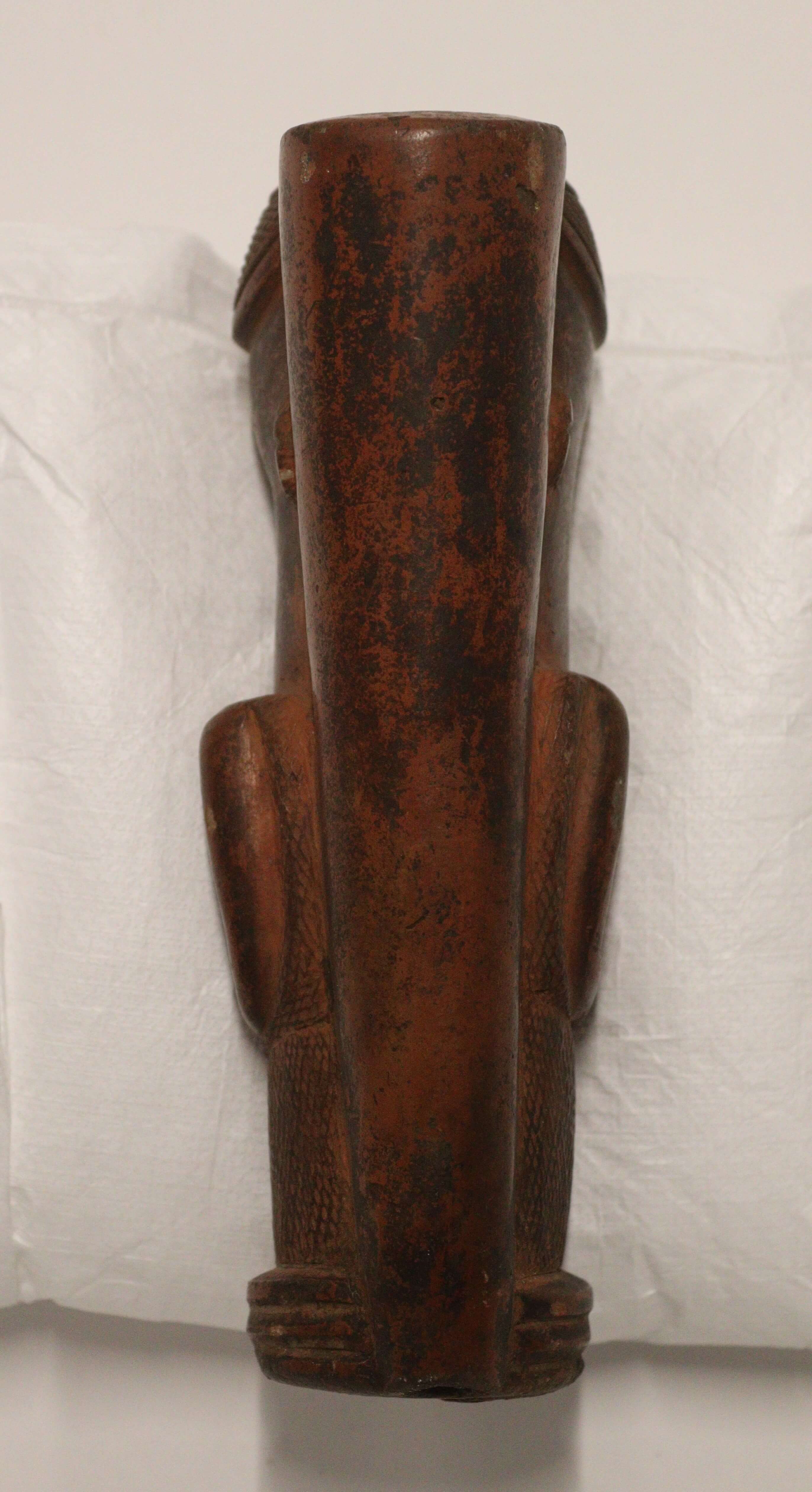 | Inscription au livre d'inventaire | Pfeifenkopf aus braunrotem Ton, in Form einer weiblichen Hockerfigur. Museum für Völkerkunde Berlin (Walden), Kauf. |