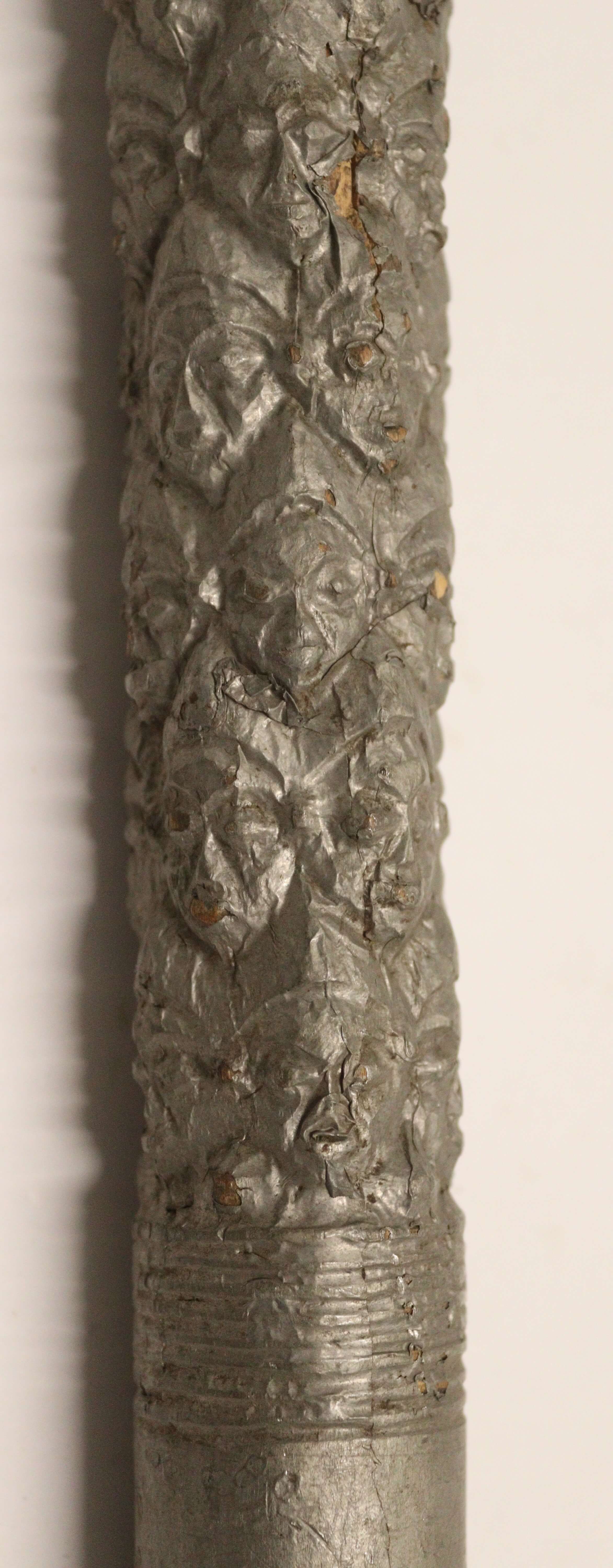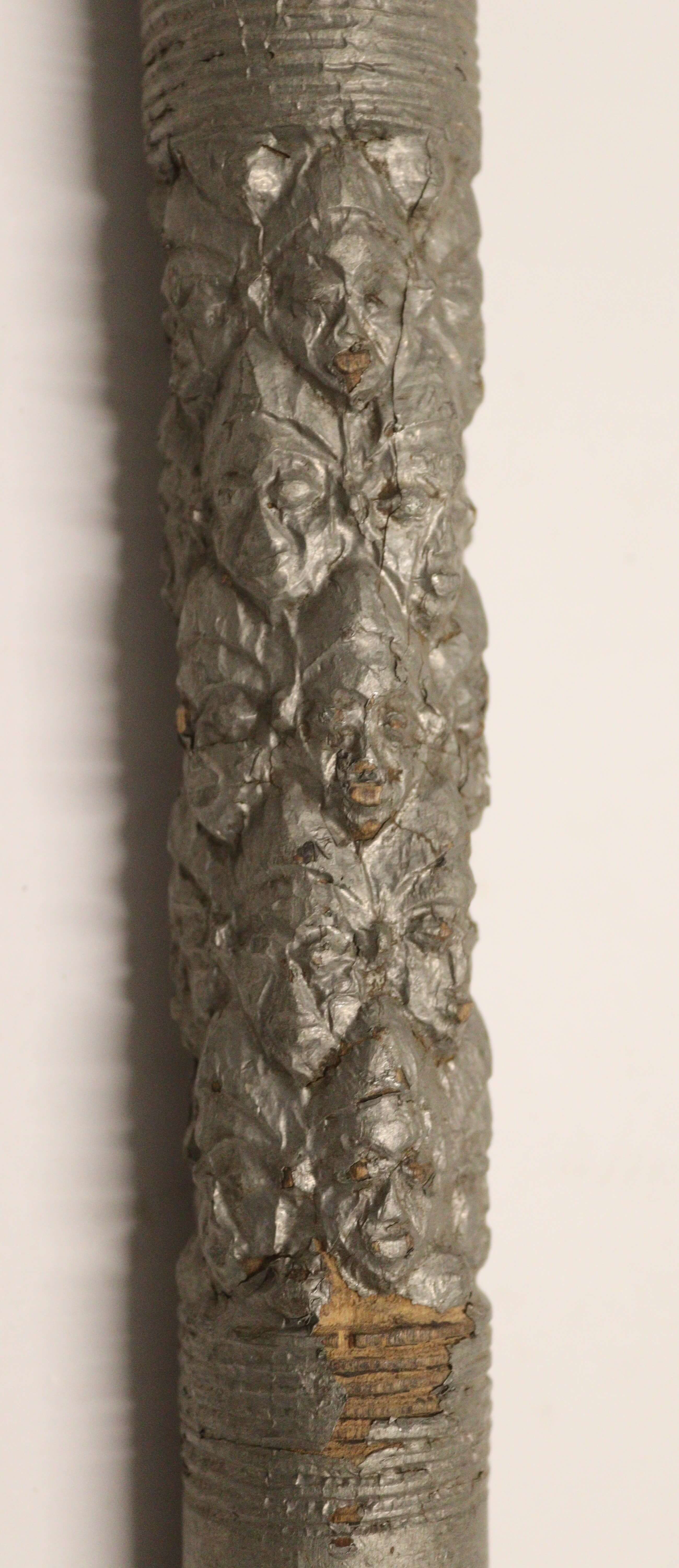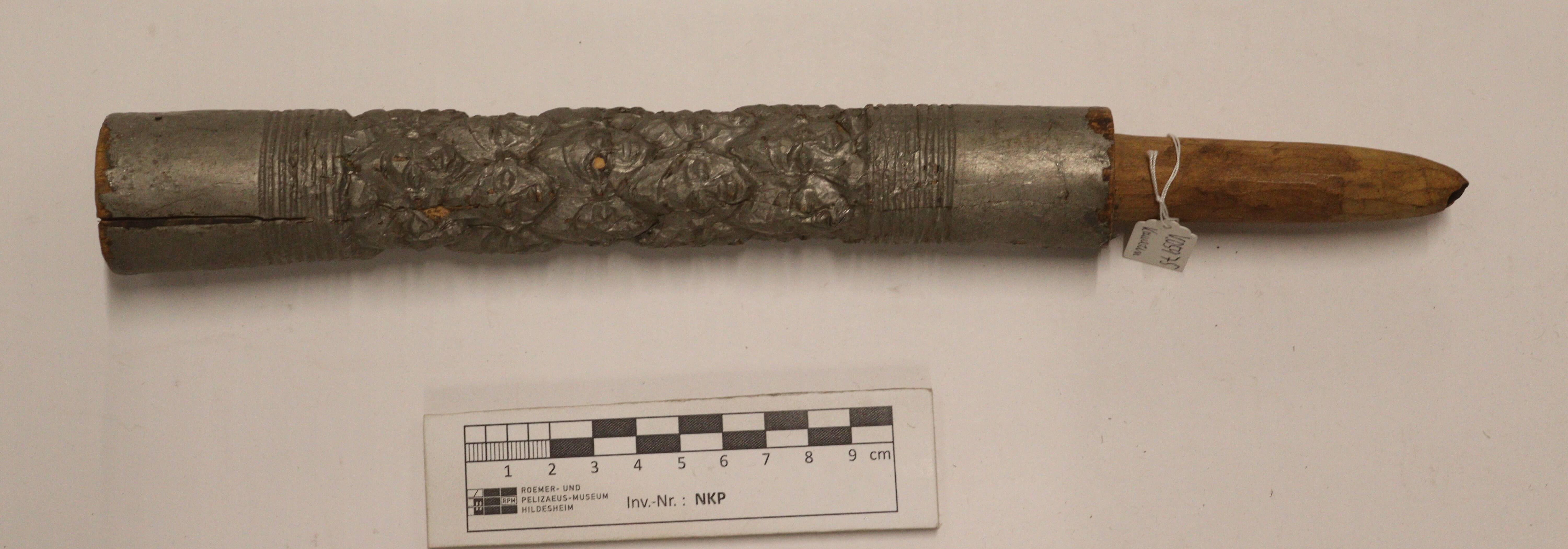 | Description | Der Überzug, laut Inventarbuch und Karteikarte aus Staniol, zeigt reliefartige menschliche Gesichter. |
