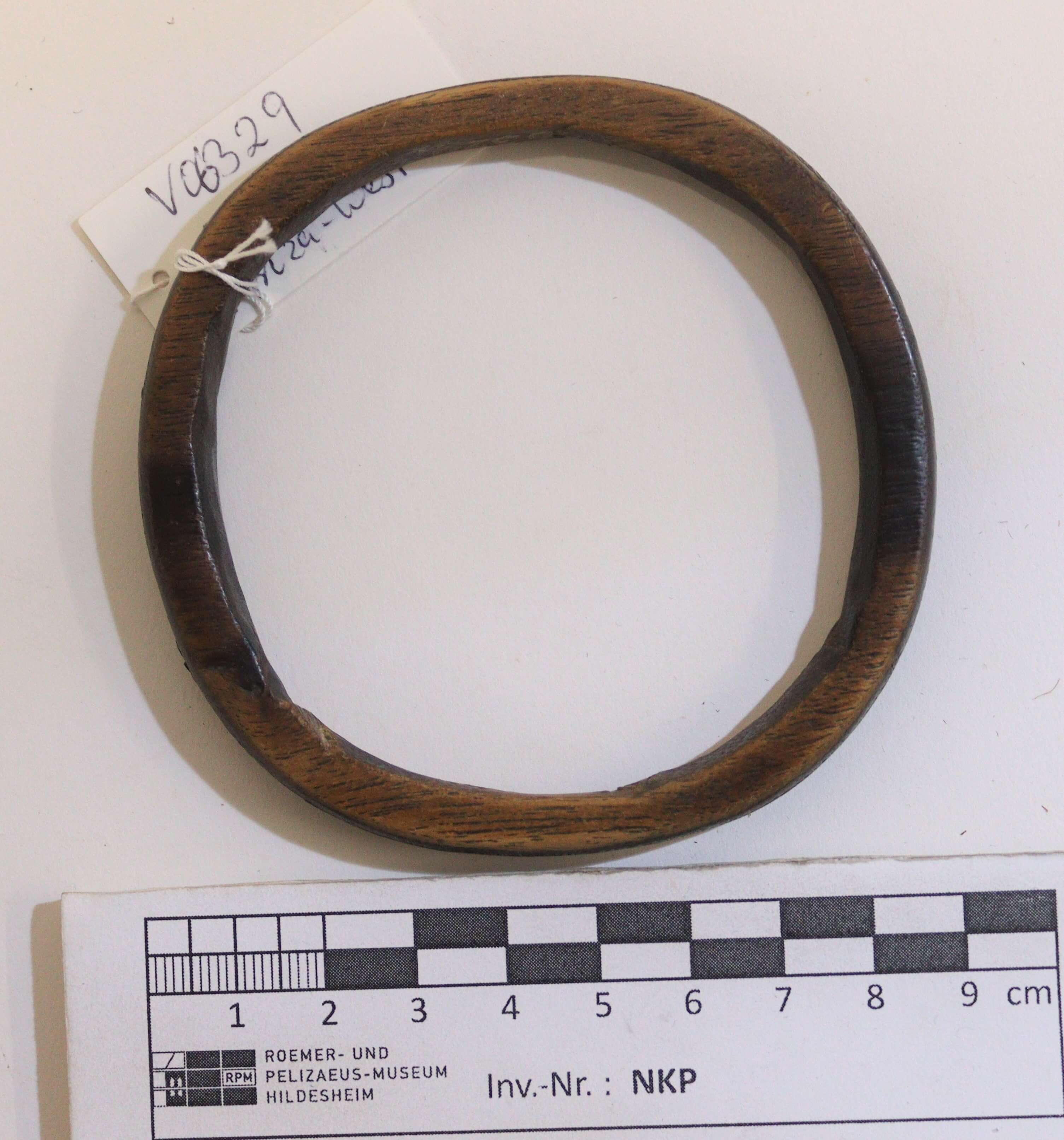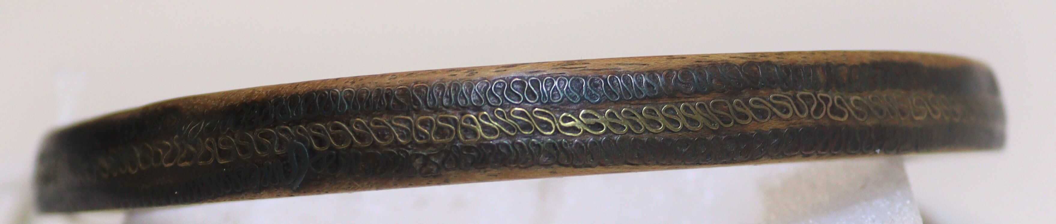 | Description | Die feinen Verzierungen des hölzernen Armrings sind mit dünnem Metalldraht eingelegt (Messing?). |