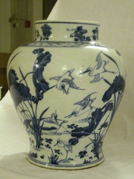 | Description | Der Dekor dieser niedrigen Balustervase ist in stumpfem Unterglasurblau gemalt. Das Bild, auf der Wandung bis zur Schulter umlaufend, zeigt Wasser mit Lotosblättern und -blüten, Schilf und Reiher. Auf der Basis innerhalb eines blauen Doppelringes ein Artemisiablatt als Marke. Das Objekt ist im Katalog durch Ohlmers Sammlung unter der Nr. 180 (1932) und Nr. 34 (1898 Blauweiß) zu finden. |