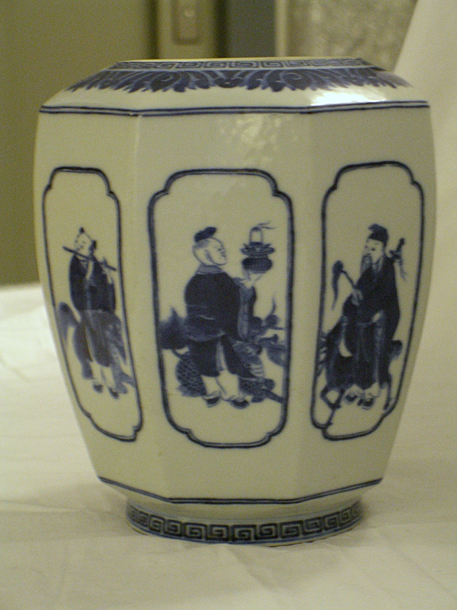 | Description | Achteckige Form, abgesetzter Fußring. Dekor: leuchtendes Unterglasurblau. An den vier Seiten in Umrahmung die acht Lohan, Jünger des Laozi. Um die Mündung Blattknospenband. Rand oben und unten mit Mäanderband. Das Objekt ist im Katalog durch Ohlmers Sammlung unter der Nr. 161 (1932) und Nr. 58 (1898 Blauweiß) zu finden. Qing-Dynastie (1644-1911) Datierung lt. Ohlmer 1932 |