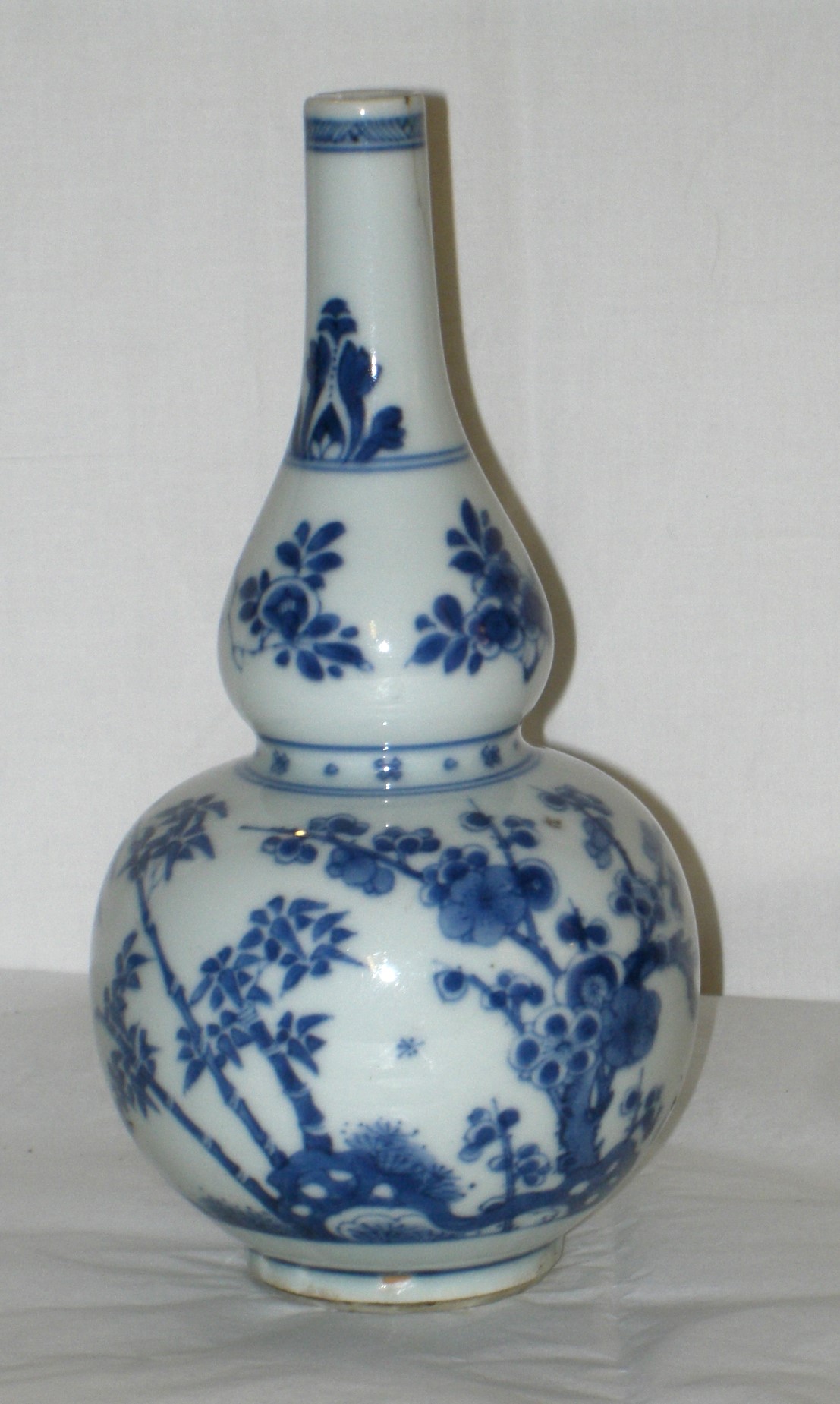 | Description | Schlanke Kalebassenform mit langem, dünnem Hals; Dekor ist in flächig laviertem, klarem Unterglasurblau gemalt: Auf dem breiten unteren Gefäßkörper ein Löcherfelsen und ein Zaun und dahinter Bambus, blühende Pflaume und Chrysantheme; an der Einschnürung ein Band mit Kreuzmuster und Punkten und darüber Blütenzweige. Qing-Dynastie (1644-1911), Kangxi-Periode (1662-1722), lt. Ohlmer-Führer 1932; Das Objekt ist im Katalog durch Ohlmers Sammlung unter der Nr. 192 (1932) und Nr. 62/63 (1898 Blauweiß) zu finden. V 11.036 und V 11.037 gehören zusammen |