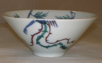 | Description | Der Dekor ist in Doucai-Technik gemalt mit Unterglasublau für die Konturlinien, in die über der Glasur die Emailfarben Grün, Rot, Gelb und Aubergine eingepasst sind: Auf der Außenseite gegenständig Phönix und Bambus, deren Oberteile über den Rand der Schale ins Innere reichen. Die Sechs-Zeichen-Marke innerhalb eines Doppelrings ist in Unterglasurblau auf die Basis geschrieben. Qing-Dynastie (1644-1911), Chenghua Marke, Yongzheng-Periode (1723-1735). Das Objekt ist im Katalog durch Ohlmers Sammlung unter der Nr. 77/78 (1932) und Nr. 37/38 (1898 Bunt) zu finden. |