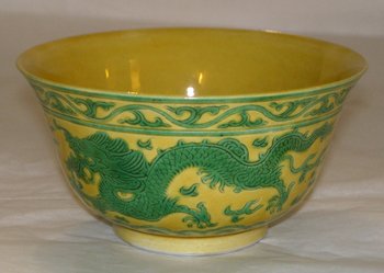 | Description | Die Schale mit grünem Dekor vor gelbem Fond ist in der sogen. Dreifarben-Technik, sancai, auf Biskuit glasiert: Auf der Außenwandung zwei grüne Drachen mit Perle zwischen einem Band mit Ruyi-Köpfen unten und einem von Doppellinien eingefaßten Band mit einer Blätterranke unterhalb der Lippe; im Inneren auf dem Grund ein Medaillon mit dem Zeichen für shou, langes Leben, innerhalb eines Doppelringes. Die Sechs-Zeichen-Siegelmarke ist in Unterglasurblau auf die neutral glasierte Basis geschrieben. Qing-Dynastie (1644-1911), Daoguang-Periode (1821-1850). Das Objekt ist im Katalog durch Ohlmers Sammlung unter der Nr. ? (1932) und Nr. 132 (1898 Bunt) zu finden. |