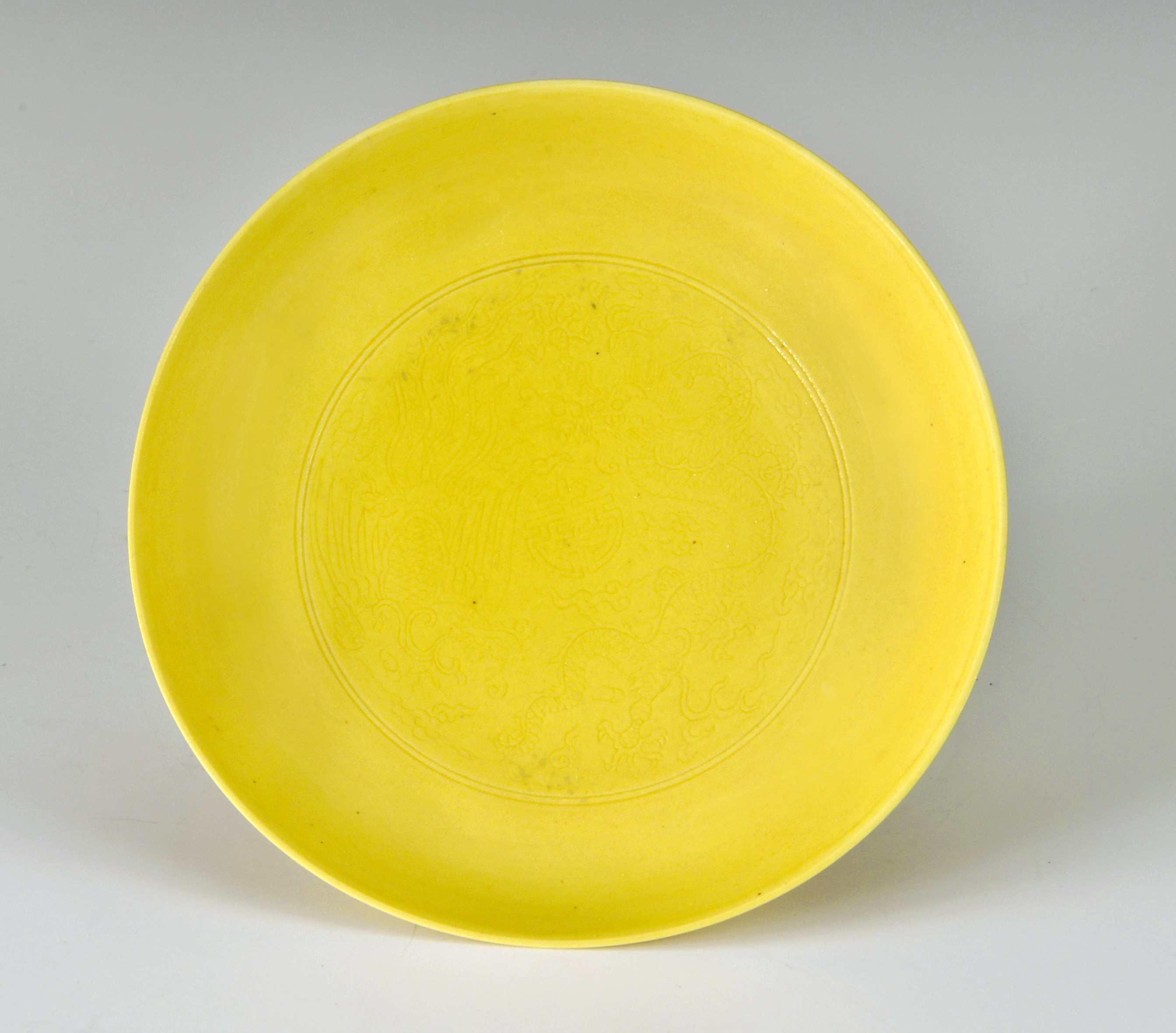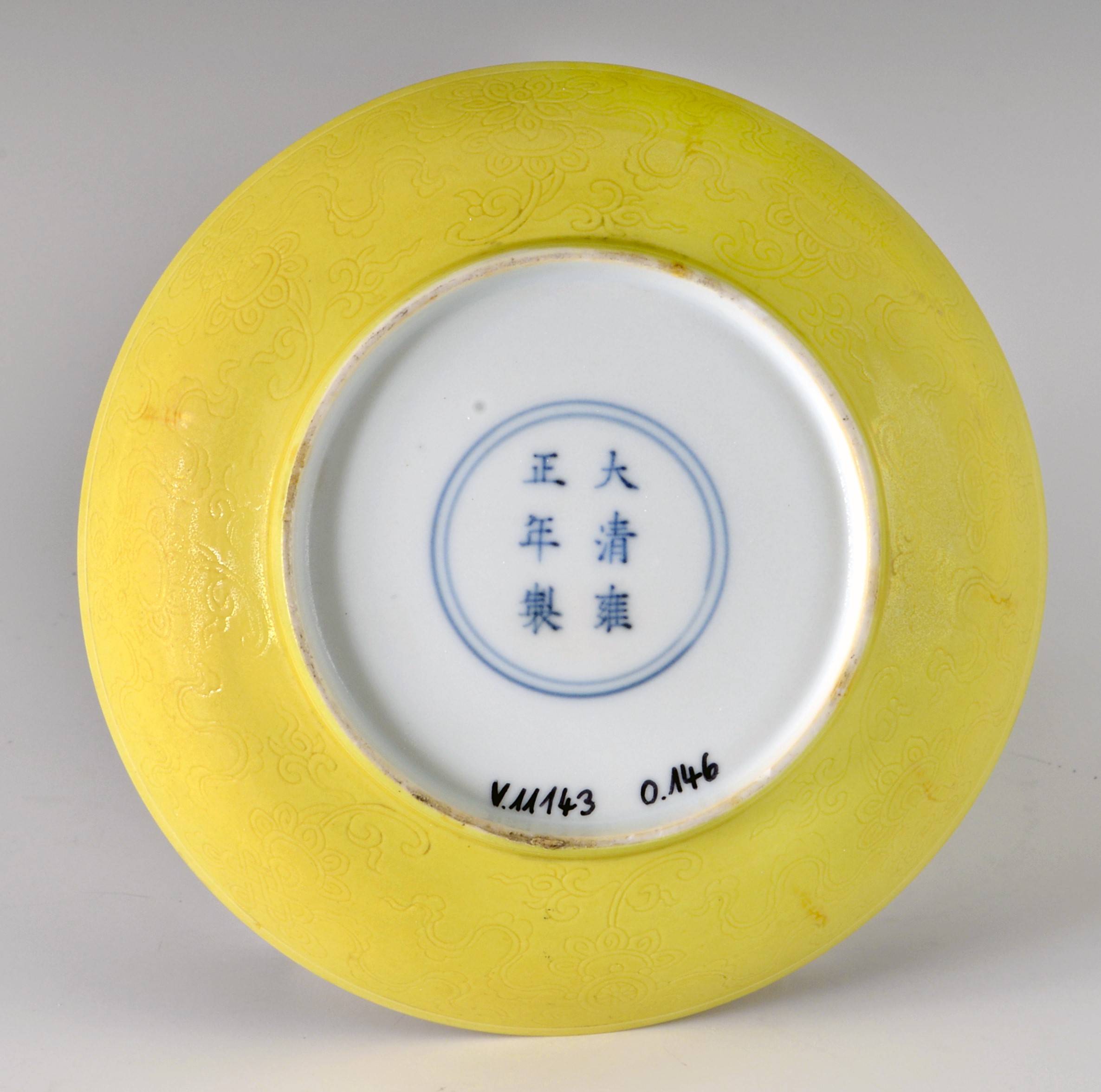 | Description | "Kaisergelber" Teller mit anhua-Dekor: Das Zeichen "shou" für Langes Leben, umgeben von zwei Drachen; außen auf Lotusblumen die acht buddhistischen Symbole; Qing-Dynastie (1644-1911) lt. Ohlmer-Katalog 1932: Yongzheng-Marke (1723-1735); Das Objekt ist im Katalog durch Ohlmers Sammlung unter der Nr. 146 (1932) und Nr. 29 (1898 Bunt) zu finden. |