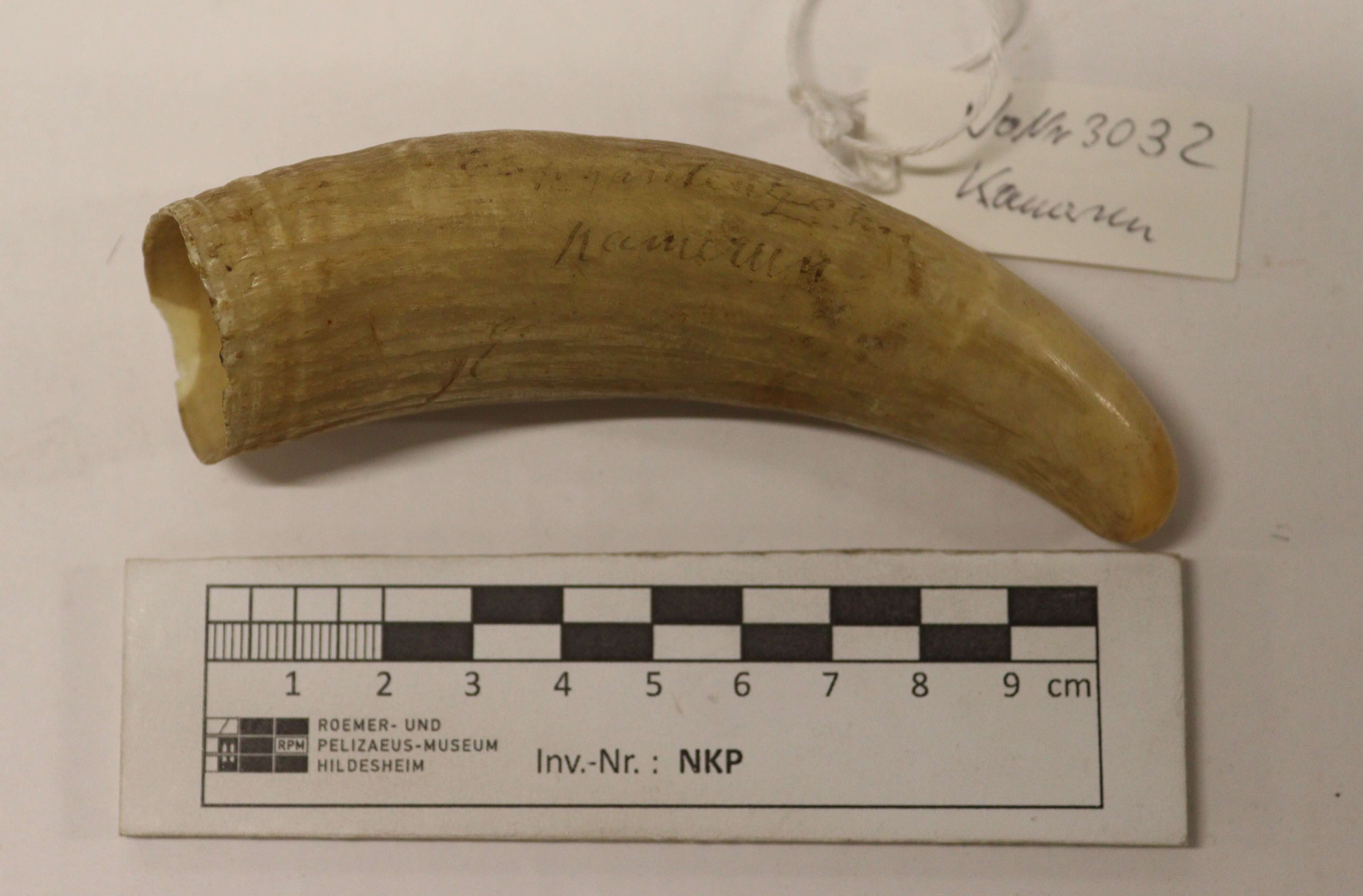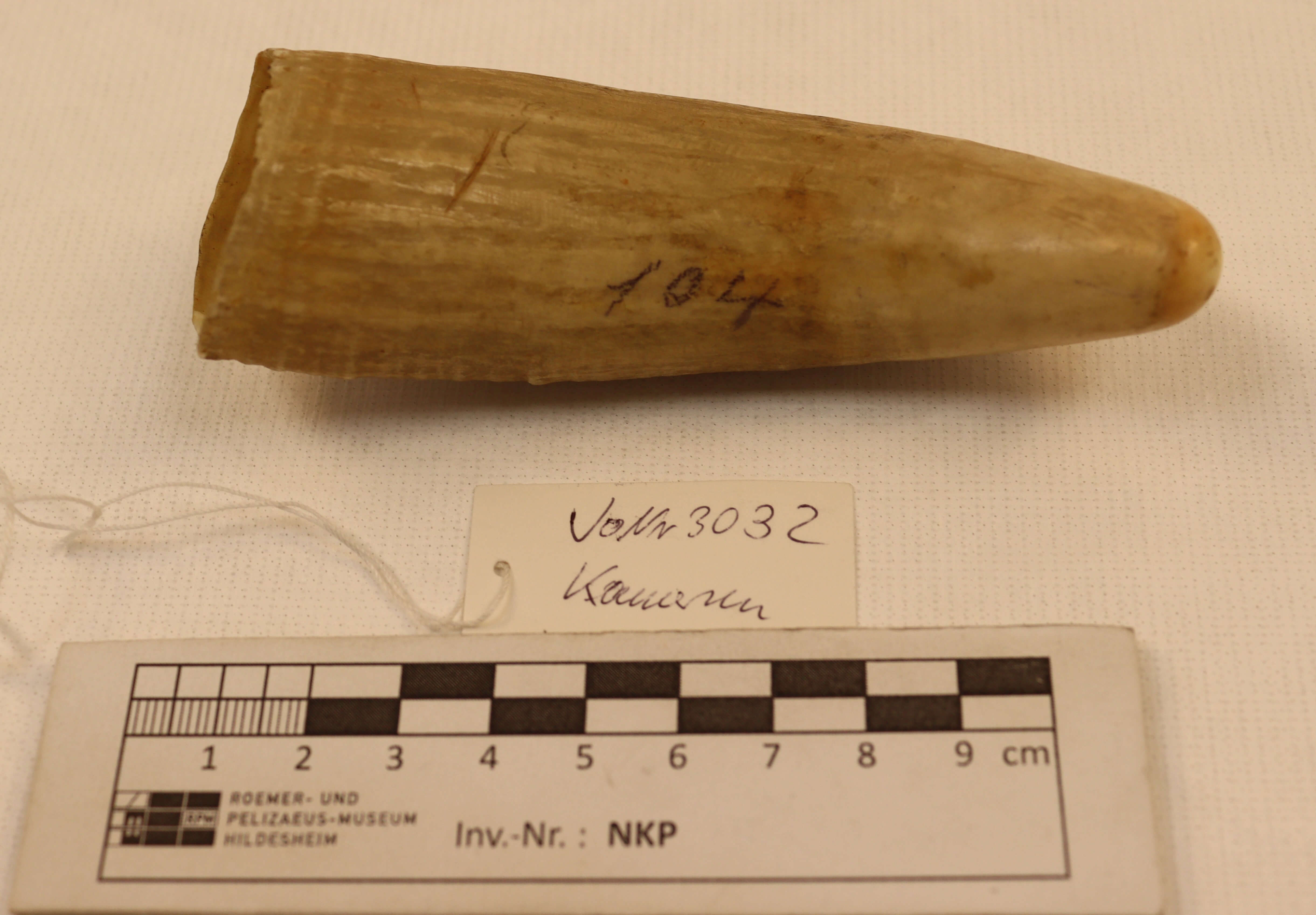 | Inscription/impression/étiquette | Beschriftung: "Elephantenzahn Kamerun"; auf der anderen Seite des Zahns die Zahl "104" |