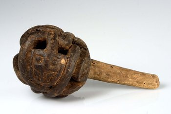 | Description | Kopf und Stiel sind aus einem Stück geschnitzt. Das Motiv ist eine doppelköpfige Schlange, wobei der zweite Kopf am Stielrand jeweils nur zur Hälfte dargestellt ist. Solche Stöpsel gibt es auch als Gelbgussarbeiten und zum Verschluss der Trinkhörner |
