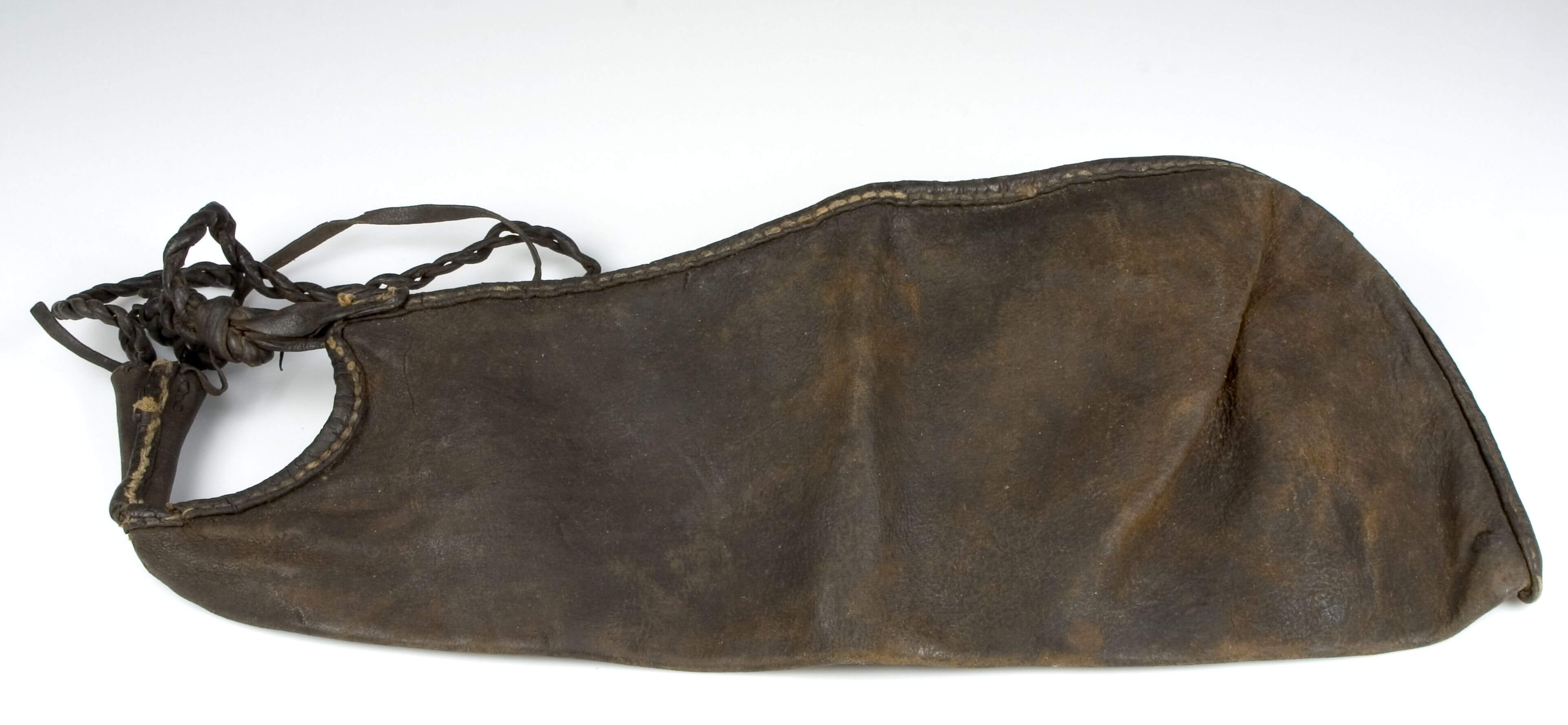| Description | Das Leder ist mit Faden aus Pflanzenfaser genäht. Im oberen Teil verjüngt sich der Schlauch zu einem Ausguss. Der Trageriemen ist ebenfalls aus Leder geflochten. |