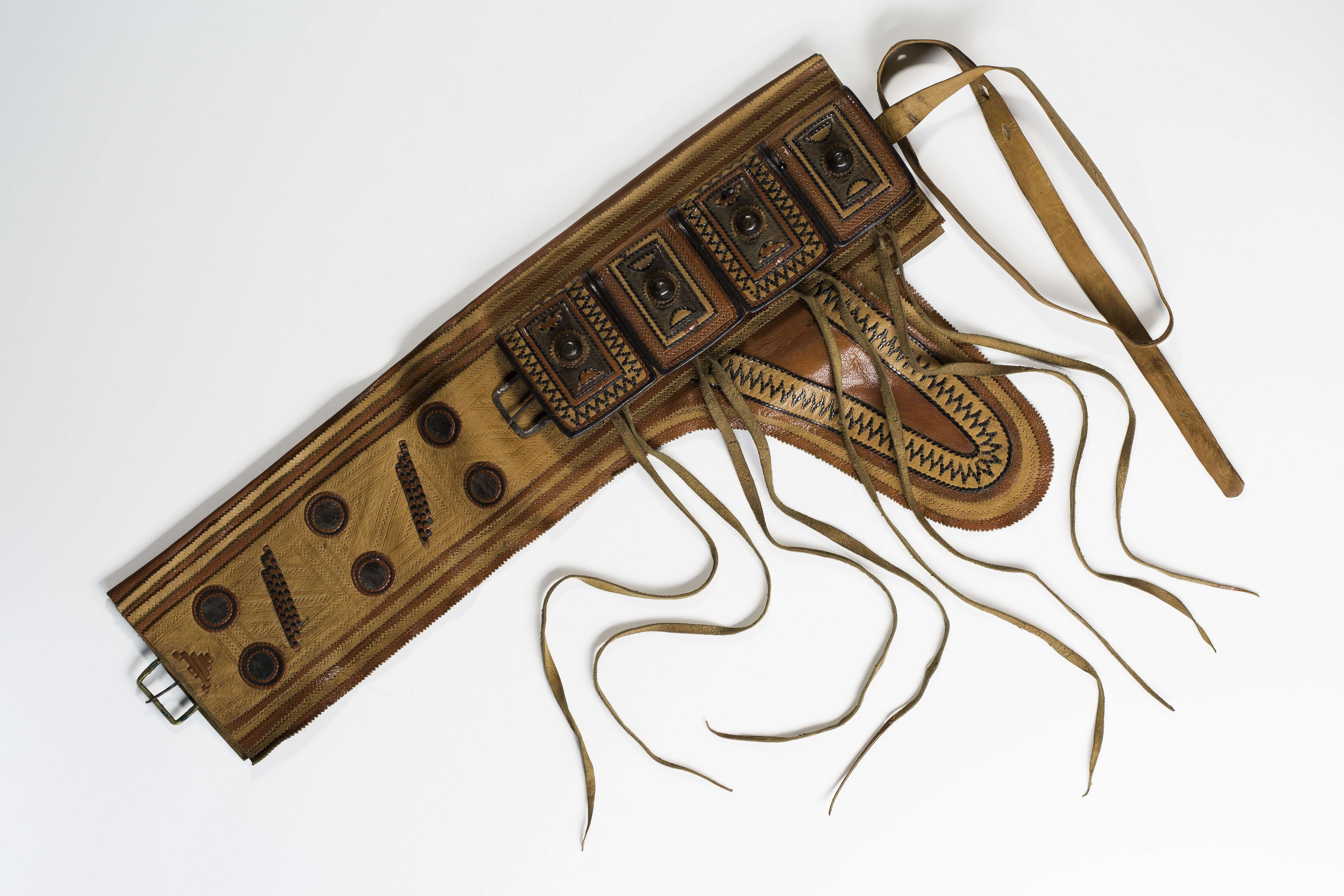 | Description | Anmerkung auf der alten Karteikarte: „Patronengurte, sehr feine Arbeiten in hellem, braunem und grünem Leder (neu). Dikoa (Marktpreis Nr. c 2 M. T. Thaler, a und b 1 M. T. Thaler). Werden von Kanuri (Bornuleuten) angefertigt, hervorragende Typen des Sattler- und Täschnergewerbes. Nr. 539 a: 75 cm lang mit 6 kleinen Taschen für Pulver.“ Nicht aufgefunden, ist aber vorhanden (aufgefunden am 4.11.2019) |