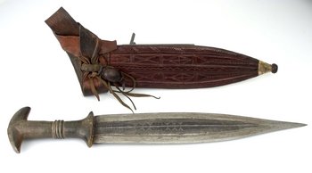 | Description | Anmerkung auf der alten Karteikarte: „Breites Dolchmesser in rother Lederscheide mit Handriemen (fein geflochten). Gulfei. Sehr ähnlich Nr. A III c 603.“ An der Scheide sind ein Tragband und ein Lederamulett befestigt. |