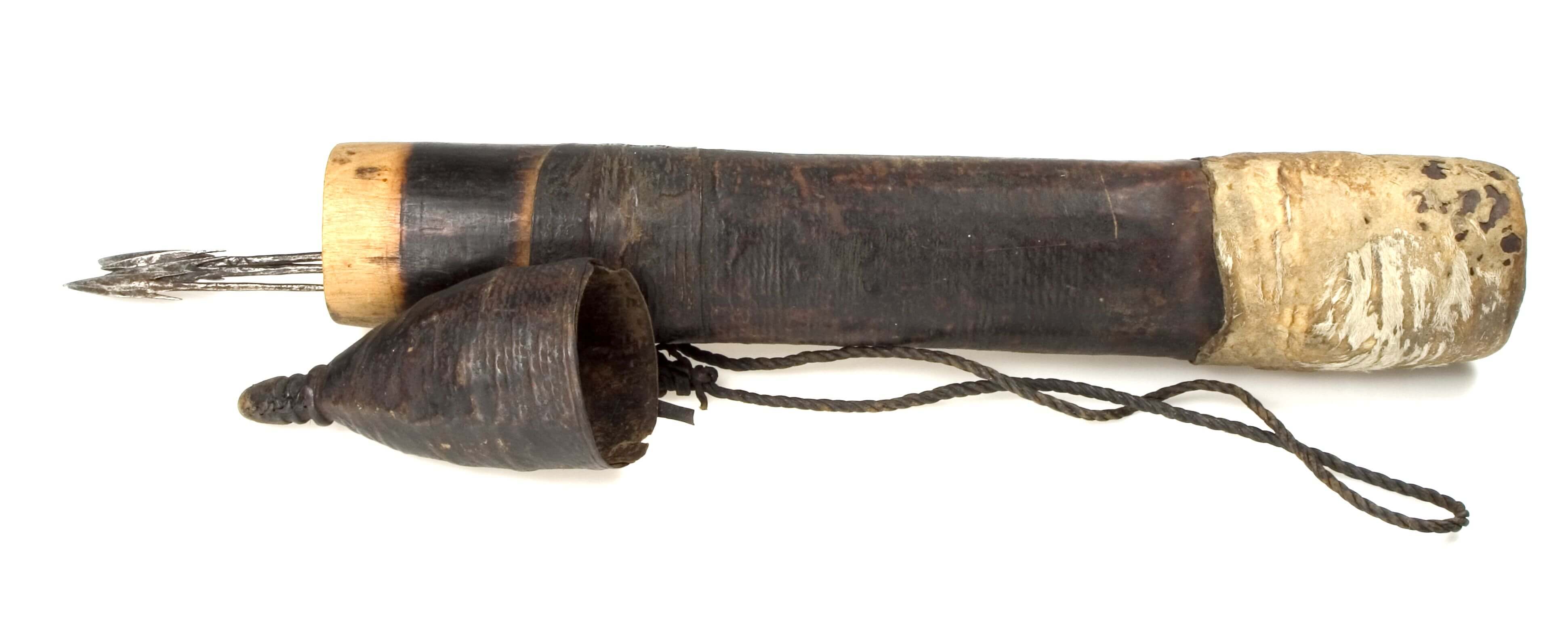 | Description | Anmerkung auf der alten Karteikarte: „Köcher (2) mit vergifteten Pfeilen (16): Eisenspitze, Rohr. Gulfei (Bogenschützen des Sultans). Hierzu Bogen A III c 610. a. Holzröhre mit Leder überzogen (6 Pfeile) ohne Deckel u. Tragband.“ b. Holzröhre mit Leder überzogen (10 Pfeile) mit Deckel u. Tragband aus geflochtenen Lederschnüren.“ Beschriftung auf dem alten Objektzettel: „zu Bogen A III c 610 b. Pfeile vergiftet! Bogenschützen des Sultans von Gulfei.“ Es sind 4 Pfeile vorhanden. Das Fell ist zum größten Teil ausgefallen. Nachtrag mit Bleistift: „Vorhanden am 26.8.1948: 6 Pfeile zu 611 a. Alles andere fehlt.“ Es sind jedoch 4 Pfeile vorhanden. Das Fell ist zum größten Teil ausgefallen. |