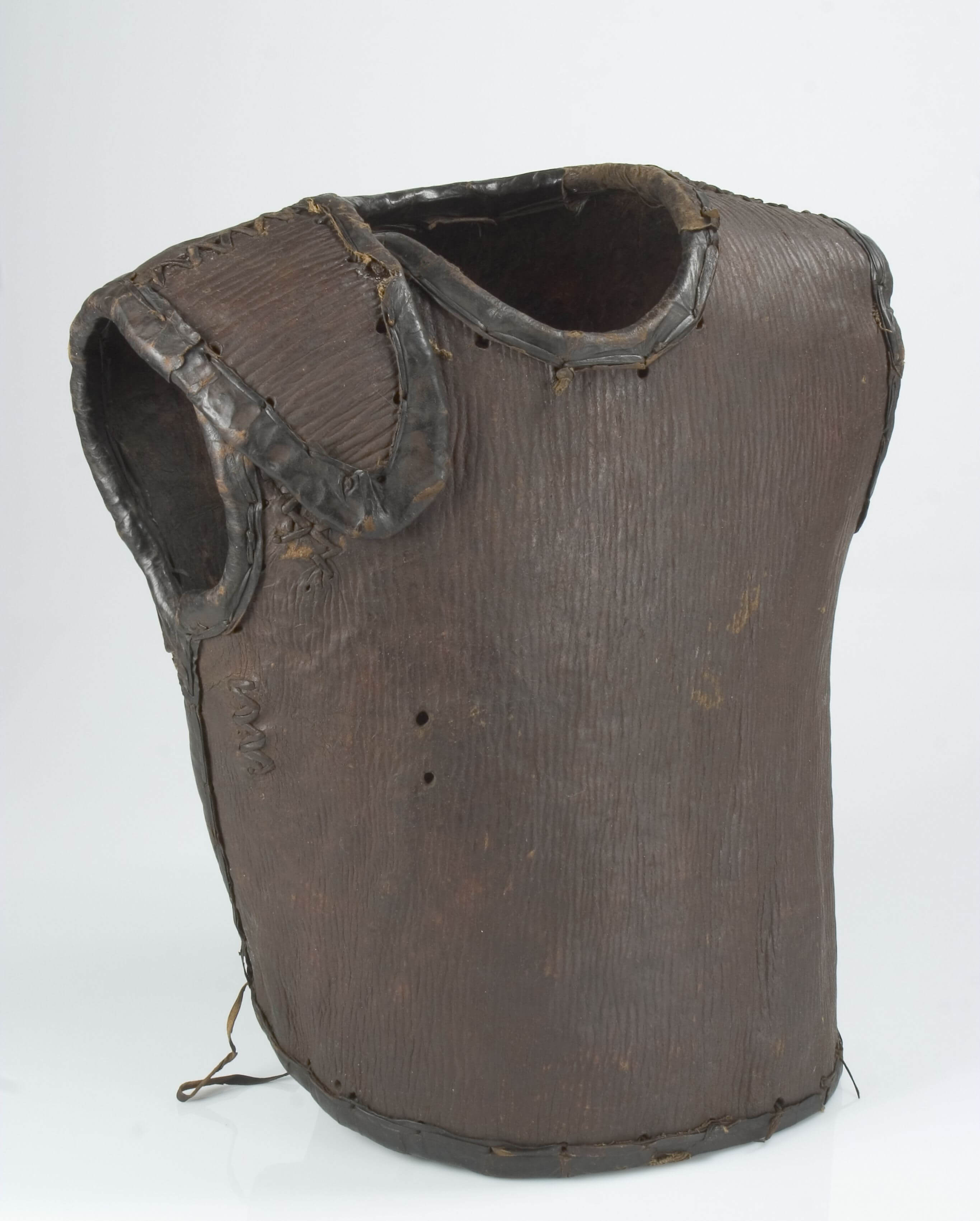 | Description | Anmerkung auf der alten Karteikarte: „Küraß aus dickem Leder (wohl Büffel). Wohl Fulla- oder Araberarbeit. Erbeutet bei einem Überfall des Musgu-Häuptlings Amarekai von Makedarua, Mandaragebirge. In der Form u. Größe ganz gleich mit dem Eisenpanzer (A III c 640).“ (1709-0408-00) Siehe auch Nr. 431 (1709-0431-00 Kriegshorn) |