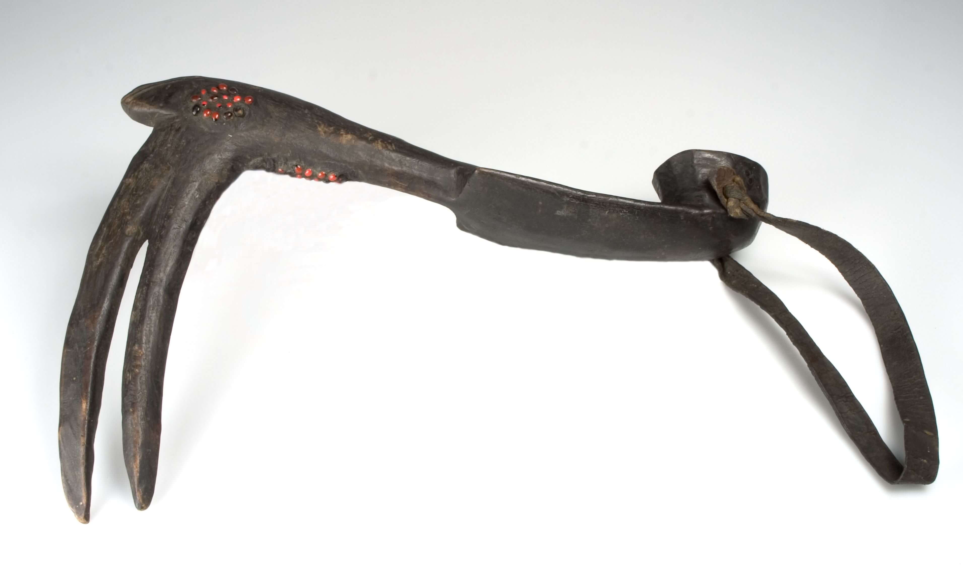 | Description | Anmerkung auf der alten Karteikarte: „Holzschnitzerei, bei der Jagd auf Hornraben benutzt. Landschaft Wolodje, von Schua-Arabern des Stammes Beni Hassem gefertigt und benutzt. Rohe Darstellung des Kopfes und Halses eines Hornraben (Bucorvus) in natürlicher Größe, aus schwarzem Holz, mit rothen Abrusbohnen beklebt. Wird mit dem Lederriemen auf dem Kopf des Jägers befestigt, der damit auf der Erde kriecht, um sich leicht an die scheuen Vögel anzuschleichen.“ |