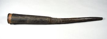 | Description | Die Bezeichnung "Durru-Heiden" aus der Kolonialzeit besteht aus zwei negativ besetzten Fremdzuschreibungen. Die heutige Selbstbezeichnung ist "Dii". Anmerkung auf der alten Karteikarte: „Das 65 cm lange schwarze Horn ist fast gerade, einfach rund u. gehört jedenfalls einer Art Oryx an, nur der untere Teil zeigt Andeutungen von Rillen oder Mulden, die vielleicht abgeschliffen sind. (Vielleicht eine noch unbekannte Art?). Die ungefasste runde Holzröhre ist mit schwarzem Leder überzogen.“ Ein auf der Karteikarte in der Mitte des Horns angegebener Tragriemen aus Leder fehlt. |