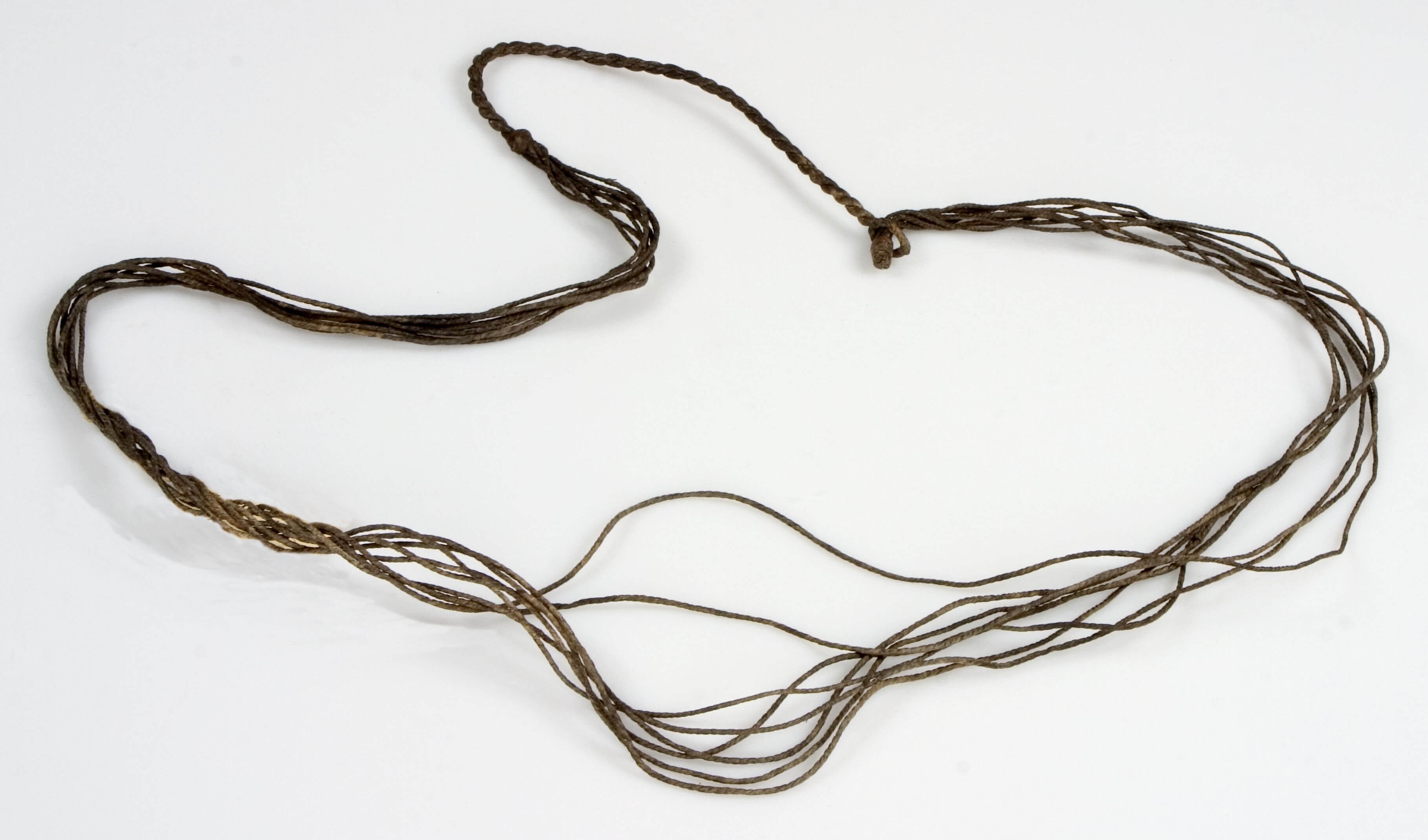 | Description | Das Band besteht aus acht gewachsten Schnüren, die auf einer Seite zusammen gedreht sind und in einer Öse auslaufen, während die andere Seite durch ein Lederstück verdickt ist. Welche heutige ethnische Gruppe das Äquivalent der auf der Karteikarte genannten "Wulya" sein könnte, konnte bisher nicht geklärt werden. Allgemein weist der Zusatz "Heiden" darauf hin, dass es sich um eine nichtislamische Gruppe handelte; die die Fulbe-Herrschaft nicht anerkannte und nicht zum Islam konvertierte, was für die deutsche indirekte Kolonialherrschaft in Nordkamerun relevant war (IB 2022). |