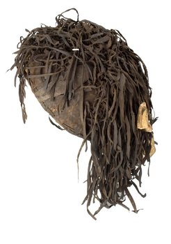 | Description | Anmerkung auf der alten Karteikarte: „Kriegskappe aus einer Art Gras geflochten, dicht mit schmalen Lederstreifchen verziert. ‚Grashut’ – Strümpell, ähnlich A III c 662 b, grob geflochten, Rand von Leder; die ganze Kappe ist über u. über mit schmalen (bis 22 cm) langen dunklen Lederstreifchen bedeckt (die eingeflochten sind), do dass man vom Flechtwerk (also von der Kappe selbst) nichts sieht. An der einen Seite sind 4 Stückchen Flaschenkürbis an Lederstreifchen als Schmuck befestigt.“ Die ethnische Zuschreibung "Tuburi-Heiden" aus der Kolonialzeit bezieht sich vermutlich auf die heutige Bezeichnung "Tupuri" aus Extrême-Nord Kamerun. Der Zusatz "Heiden" weist darauf hin, dass es sich um eine nichtislamische Gruppe handelte; die die Fulbe-Herrschaft nicht anerkannte und nicht zum Islam konvertierte, was für die deutsche indirekte Kolonialherrschaft in Nordkamerun relevant war (IB 2022).