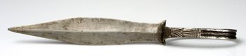 | Description | Anmerkung auf der alten Karteikarte: „Dolch mit Ring für die Hand aus einem Stück geschmiedet. Britisch Nord-Nigeria. Basra-Heiden, Muntschi (Landschaft am Benue). Sehr kunstvolle Schmiedearbeit, die Schlinge zum Durchstecken der Hand mit hübschem eingraviertem Muster, nur 75 mm in Lichten weit, also für eine größere Hand zu eng.“ Welche heutige ethnische Gruppe das Äquivalent der auf der Karteikarte genannten "Basra-Heiden" sein könnte, konnte bisher nicht geklärt werden. Der Zusatz "Heiden" in der kolonialzeitlichen Beschreibung weist darauf hin, dass es sich um eine nichtislamische Gruppe handelte; die die Fulbe-Herrschaft nicht anerkannte und nicht zum Islam konvertierte (IB 2022). Vgl. siehe Nr. 592 Spannmesser der Dowayo |